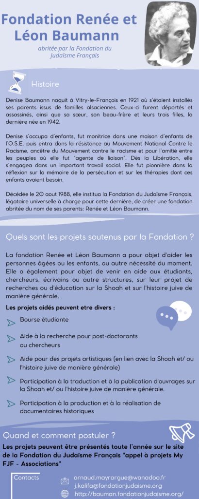 Solidarité en apportant, « selon les besoins du moment », écrit-elle dans son testament, un soutien à des actions d’aide à des familles, des personnes âgées ou des jeunes en difficulté. Solidarité encore en facilitant un projet d’études ou de recherche, en aidant un étudiant, un chercheur ou un écrivain. Souvenir toujours, car certains de ces projets toucheront l’histoire de la Shoah. Souvenir surtout, car la solidarité et l’amour de l’homme ont été la réponse – et peut-être était-ce la seule possible – que Denise Baumann a apportée aux déchirures d’un siècle qui a trop souvent nié l’humanité.