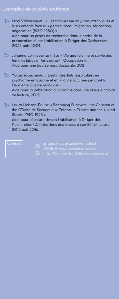 - Johanna Lehr pour sa thèse « Vie quotidienne et survie des femmes juives à Paris durant l’Occupation ». Aide pour une bourse postdoctorale, 2021.