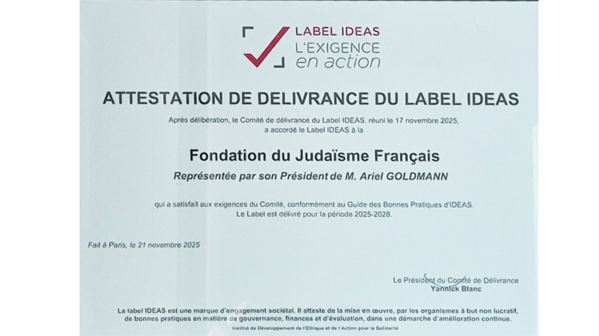 La Fondation du Judaïsme Français obtient à nouveau le Label IDEAS, le 21 novembre 2025, après une première labellisation en 2022.